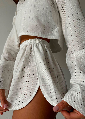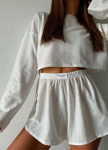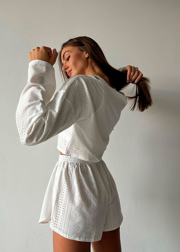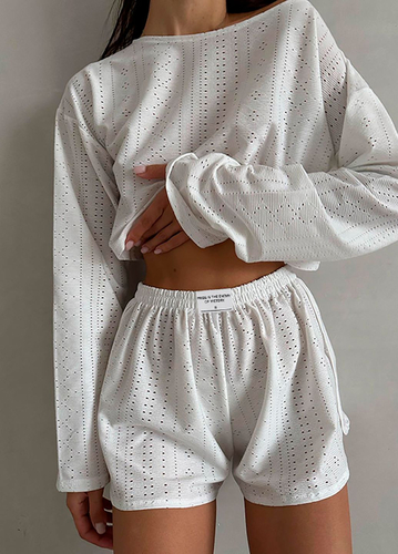 М’яка та зручна жіноча піжама білого кольору. Виготовлена з тканини з орнаментною перфорацією. У комплекті: лонгслів вільного крою, шортики з високою талією та вирізами з боків. Ідеальний комплект для дому та сну.