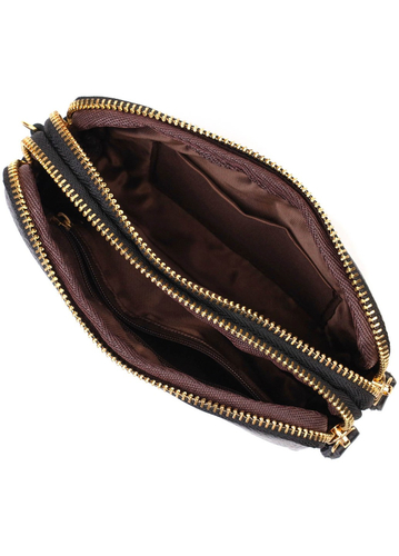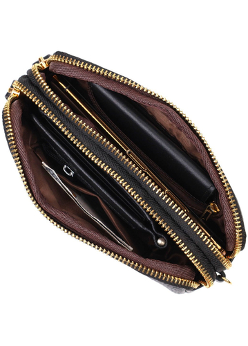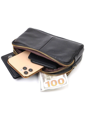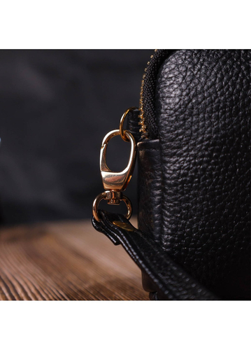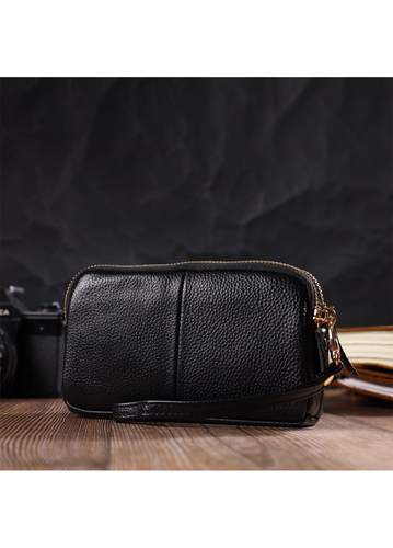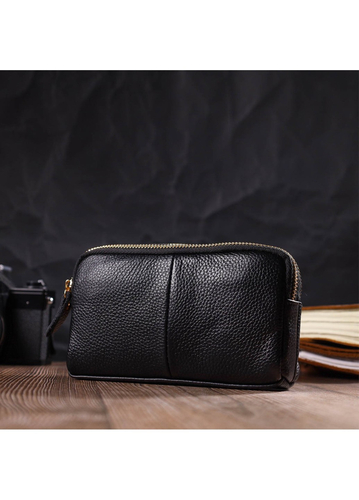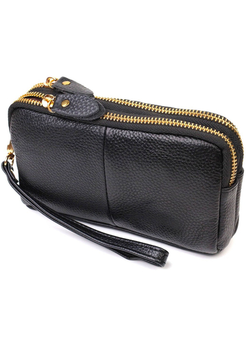 Колір: чорний; Матеріал: натуральна шкіра високої якості; Розмір (ШхВхГ, см): 17х9х4,5 см; Країна виробник: Китай. Усередині: - два основні відділення на блискавці; - потайна кишеня на блискавці; - бічна кишеня відкритого типу; - знімний кистьовий ремінь. Відмінна жіноча сумочка-клатч із натуральної мякої шкіри високої якості. Виріб дуже зручний, можна носити в руці та на запясті, відмінний варіант для любителів невеликих сумок. Модель доповнена фурнітурою золотистого кольору. Аксесуар має два основні відділення у яких по кишеньці - на блискавці та відкритого типу. Закривається клатч на блискавку.