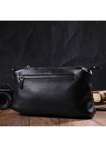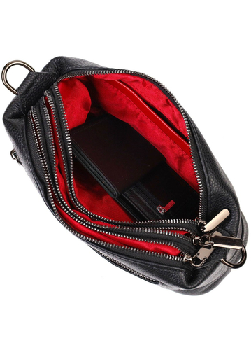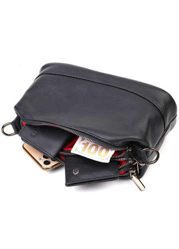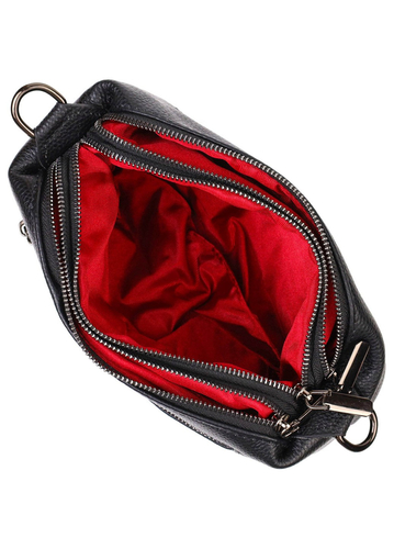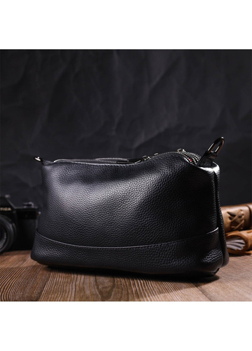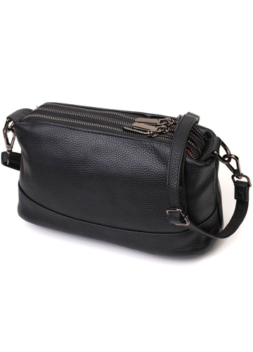 Колір: чорний; Матеріал: натуральна шкіра високої якості; Розмір (ШхВхГ, см): 27х12х9,5 см; Країна виробник: Китай. Усередині: - три основні відділення; - потайна кишеня на блискавці; - бічна кишеня відкритого типу; - кишеня на блискавці зовні; - знімний плечовий ремінь. Жіноча сумочка з натуральної шкіри високої якості, в класичному чорному кольорі. Виріб дуже зручний, можна носити на плечі, через плече та під рукою. Модель доповнена фурнітурою кольору темного срібла. Аксесуар має три основні відділення у яких дві кишеньки - на блискавці та відкритого типу, а також кишеня на блискавці зовні. Закривається модель на блискавки, кожне відділення. Ідеальний варіант для будь-якої дівчини на будь-який сезон.